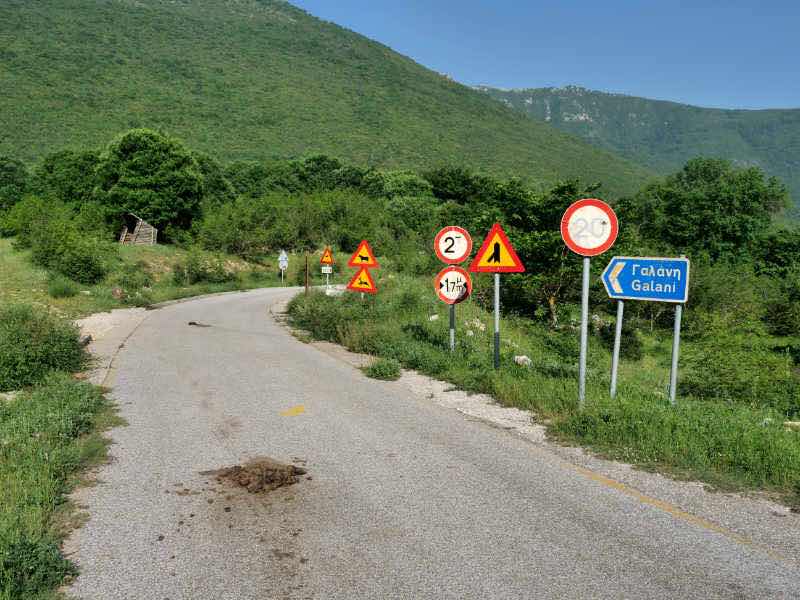 Wir wissen nicht, ob sich hier jemand einen schlechten Scherz erlaubt hat (vielleicht treten wir demnächst im Fernsehen auf, in der „versteckten Kamera“), wir wollen aber das Risiko einer Weiterfahrt nicht eingehen. Die Rückfahrt beschert uns weitere 11 Kilometer Zittern, ob uns ein Auto entgegen kommt (was nicht passiert). Statt noch 10 müssen wir nun 50 Kilometer zurücklegen, bis wir den Parkplatz bei der Nestos-Schlucht erreichen.