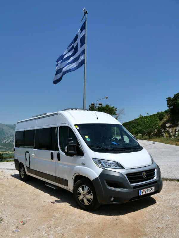 Dann wird es dramatisch. Um auf den Korilovos-Hügel zu gelangen, müssen wir die Stadt Drama durchqueren und dramatische Serpentinen hinauf fahren. Der Lohn der Mühsal ist ein Foto von Ludwig vor der griechischen Flagge.