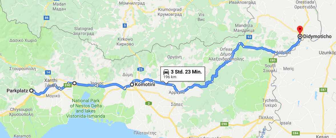Bevor wir das Dessert zu uns nehmen können, hält plötzlich ein Auto mit drei Insassen. Sie weisen sich als Polizisten aus, wollen Pässe und Führerschein sehen und fragen, warum wir hier unterwegs sind und nicht weiter östlich auf der Autobahn. Dieses Gebiet sei wegen Flüchtlingen und Schleppern gefährlich, und wir dürften nicht bleiben, sondern sollten in einer Stadt übernachten. Also machen wir uns wieder auf den Weg. Wir durchqueren einige kleine Dörfer. Hinter einer Brücke bemerke ich ein Polizeiauto und rechne mit einer weiteren Ausweiskontrolle. Diesmal drehe ich den Spieß um, bleibe stehen und erkundige mich bei einem der Polizisten, wo wir die Nacht verbringen können. Er schickt uns nach Didymoticho, eine Stadt nicht weit von der türkischen Grenze, rund 30 Kilometer entfernt. In maps.me entdecken wir dort einen Parkplatz, den wir im Navi als Ziel eingeben. Leider ist nicht erkennbar, dass wir dabei in ein Gewirr enger Gassen gelangen, in denen das Reisemobil nur mit Mühe an den geparkten Autos vorbeimanövrieren kann. Als wir schließlich wieder eine etwas breitere Straße erreichen, halten wir bei erster Gelegenheit an, um hier zu schlafen.