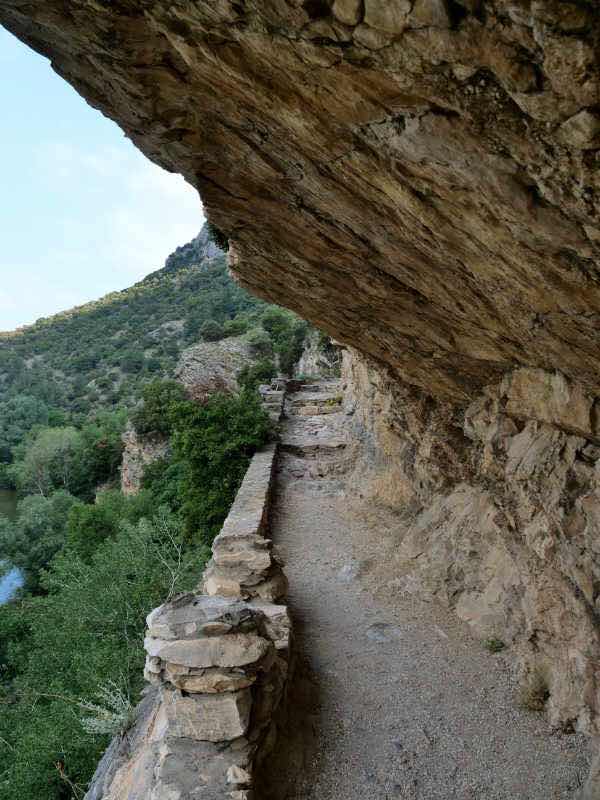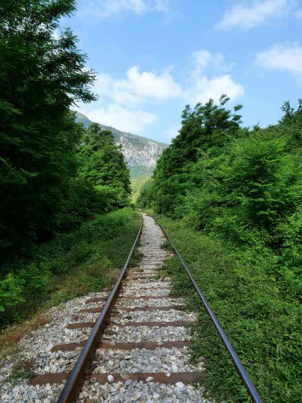 Eine Eisenbahnlinie führt durch die Schlucht. Einmal unterquert man sie in einem Tunnel, ein anderes Mal muss man die Schienen überqueren.