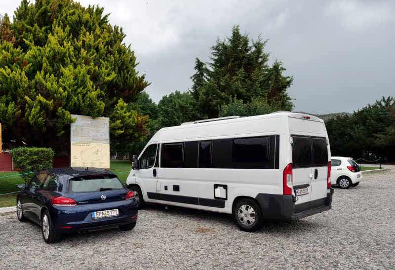 Während der Weiterfahrt nach Kavala beginnt es zu regnen. Schon ein paar Kilometer vor der Stadt weisen Schilder darauf hin, dass die Hauptstraße durch die Altstadt nur von Autos mit einer Breite unter zwei Metern befahren werden darf - also nichts für unseren Ludwig. Für die Alternativroute am Hafen entlang gilt eine Gewichtsbeschränkung von 3,5 Tonnen. Damit haben wir kein Problem. Problematisch wird es allerdings, als wir zu einer Straßensperre kommen und die Umleitung in die Altstadt führt. Es ist zwar nicht wahrscheinlich, dass unser Reisemobil diese Umleitung nicht schafft, aber von engen Altstadtgassen haben wir nach Didymoticho die Nase voll. Wir drehen daher um und gelangen über Nebenstraßen nach Krinides, wo wir uns auf den großen Parkplatz bei der Ausgrabungsstätte von Philippi stellen. Es hat zwar inzwischen zu regnen aufgehört, aber bis zum Ende der Öffnungszeit um 20 Uhr verbleiben nur mehr eineinhalb Stunden - nicht genug für eine Besichtigung. Die Dame an der Kasse sagt mir, es wäre kein Problem, auf dem Parkplatz zu übernachten. Falls wir aber doch vertrieben werden sollten, haben wir auf der Herfahrt einen einsamen Picknickplatz gesehen, der eine gute Alternative ist.