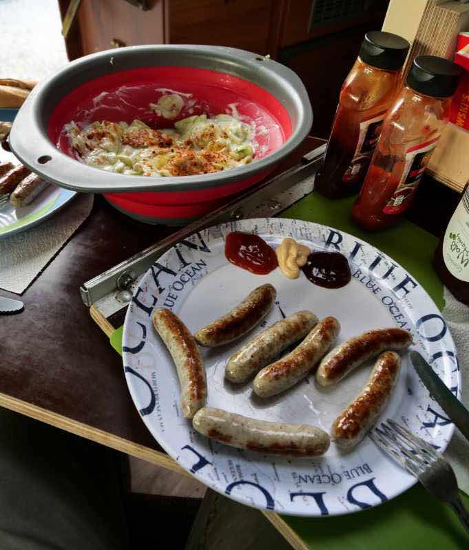 Zum Abendessen gibt es heute Bratwürste mit Gurkensalat, danach wieder Erdbeeren mit Joghurt und Honig.
