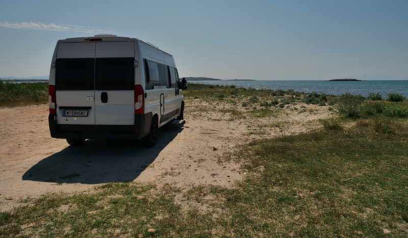 Wenig später müssen wir einen 5 Kilometer langen Umweg über einen nicht asphaltierten Feldweg zu einer Brücke machen, da das Wasser in einem Überschwemmungsbereich zu hoch steht. Nach rund 60 km Fahrt mit kaum Verkehr bringt uns eine Stichstraße zwischen zwei Seen an die See - wäre es schon Abend, hätten wir hier einen einsamen Übernachtungsplatz gefunden (leider ohne Flamingos, die die Autoren des Womo-Reiseführers in der Nähe gesehen und fotografiert haben).