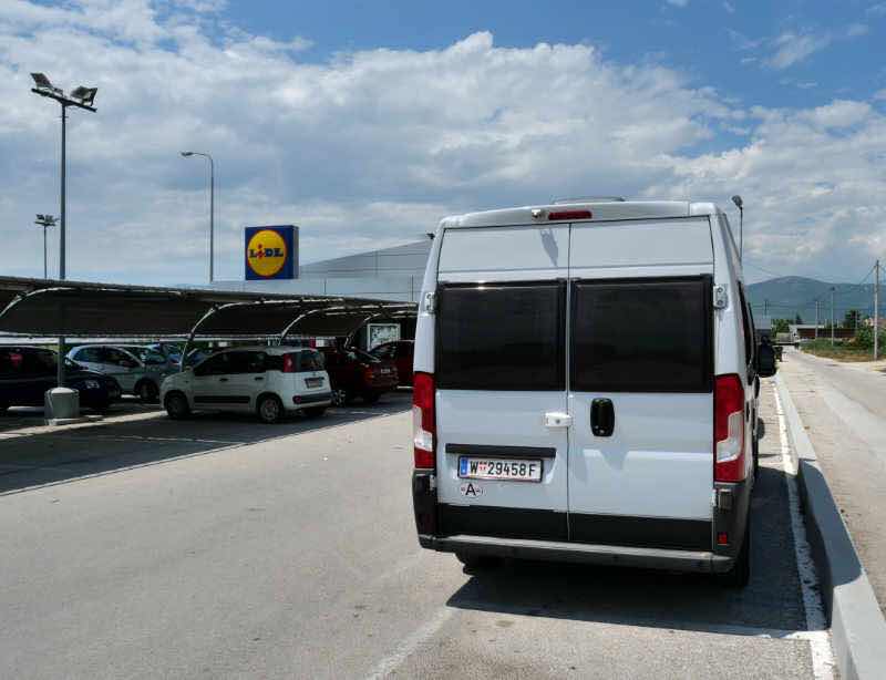 ... essen wir zu Mittag und überlegen die weitere Route. Wir beschließen, nach Keramoti zu fahren. Tomtom will uns über Xanthi leiten, setzt sich damit aber nicht durch. Wir durchqueren statt dessen das Nestos-Delta auf gut ausgebauten Straßen, die oft ein bis zwei Kilometer kerzengerade verlaufen und wo wir kaum anderen Fahrzeugen begegnen. Als uns auf der anderen Seite des Flusses zufällig ein Lidl über den Weg läuft, nutzen wir die Gelegenheit für einen Einkauf.