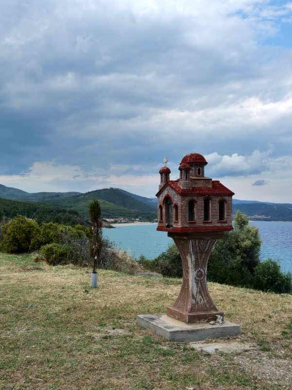 Einige Kilometer weiter südlich gibt es einen eigenartigen Ort: es wirkt, als seien die Häuser eines Dorfes spurlos verschwunden, nur die asphaltierten Straßen zwischen ihnen blieben erhalten - willkommen in der Twilight Zone! Wir haben hier zwar keinen Strand, aber eine herrliche Aussicht auf den Berg Athos.