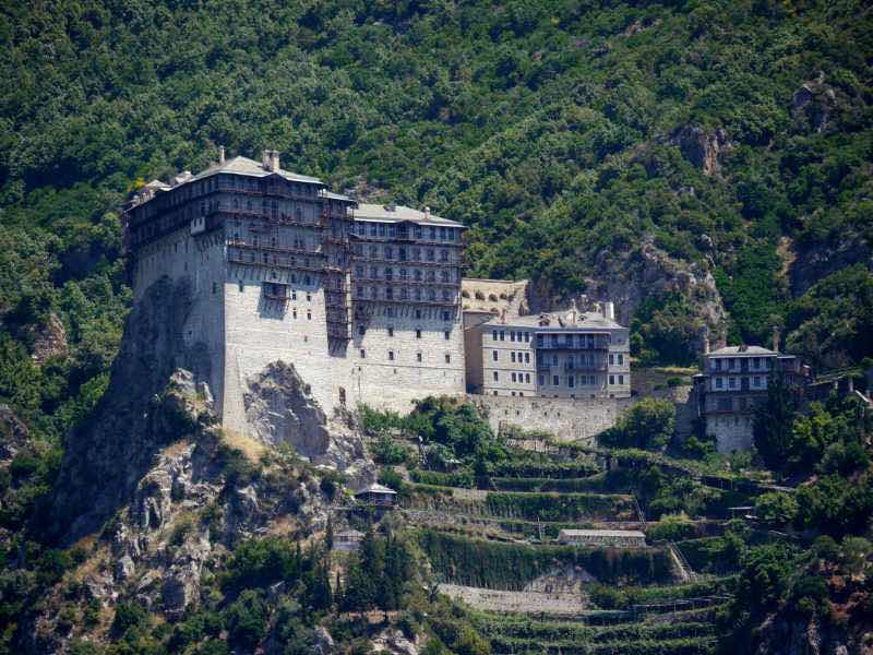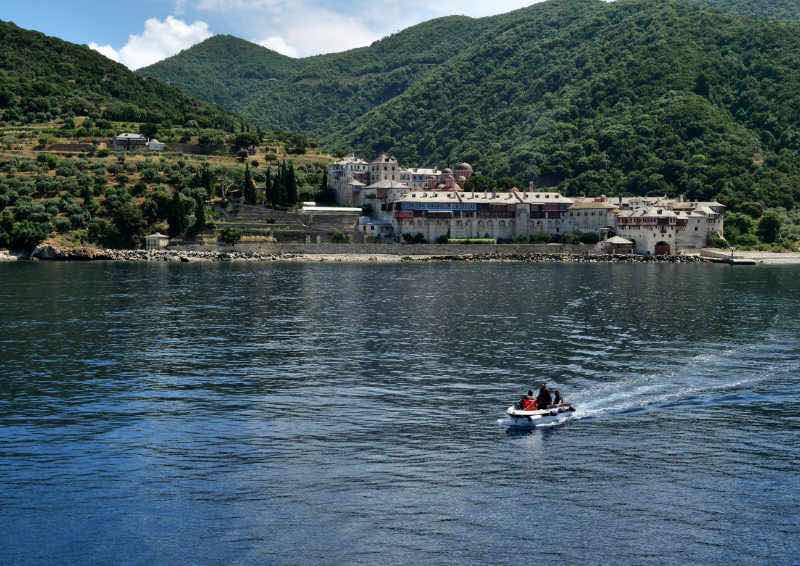 Wir gehen an Bord und kaufen Tickets (20 Euro pro Person) für die dreistündige Fahrt entlang der Halbinsel Agio Oros, des östlichen Chalkidiki-Fingers. Die Abfahrt zur Klösterbesichtigung aus ein paar Hundert Meter Entfernung (näher darf man der Mönchsrepublik Athos nicht kommen) erfolgt 15 Minuten verspätet. Nachfolgend ein paar Aufnahmen dieser Exkursion:
