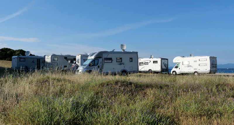 Es wird langsam Zeit, sich nach einem Stellplatz für die Nacht umzusehen. Ein Plätzchen am Strand bald hinter Sarti ist überfüllt, als handle es sich um einen Campingplatz - da wollen wir nicht bleiben.