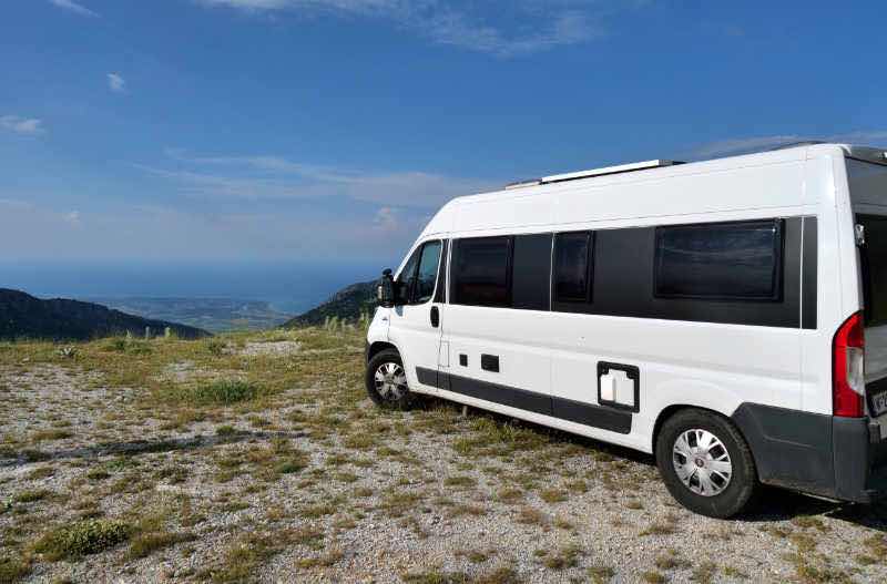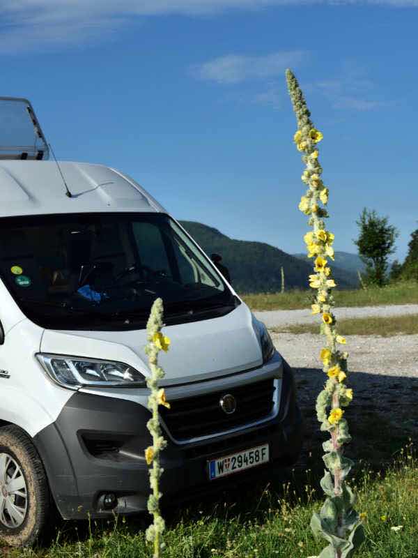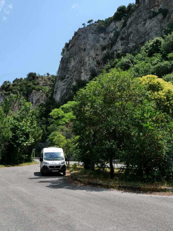 In rund 1500 m Höhe gibt es eine geschlossene Berghütte, einen Brunnen und eine Parkmöglichkeit, die sich ein Schweizer Campervan geschnappt hat. Wir kämen hier zwar auch noch unter, aber wir haben ca. 300 Höhenmeter weiter unten einen großen, ebenen Platz mit großartiger Aussicht entdeckt (so sieht man von hier beispielsweise den Olymp, der sich schon den ganzen Tag in Wolken hüllt).