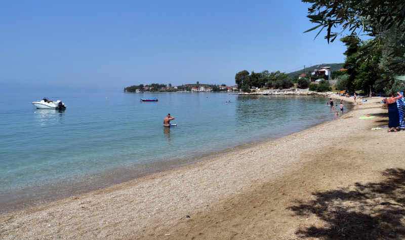 Das wichtigste für uns (neben der Entsorgungs-Möglichkeit; die Versorgung mit Wasser ist in Griechenland auch außerhalb von Campingplätzen bei vielen Brunnen möglich) ist der Strand. Wir schnorcheln und schwimmen sowohl nach dem Mittag- als auch nach dem Abendessen. Die Zeit dazwischen sitzen wir bei 32 Grad im Schatten bei Ludwig und lesen aktuelle Zeitschriften in der Readly-App.