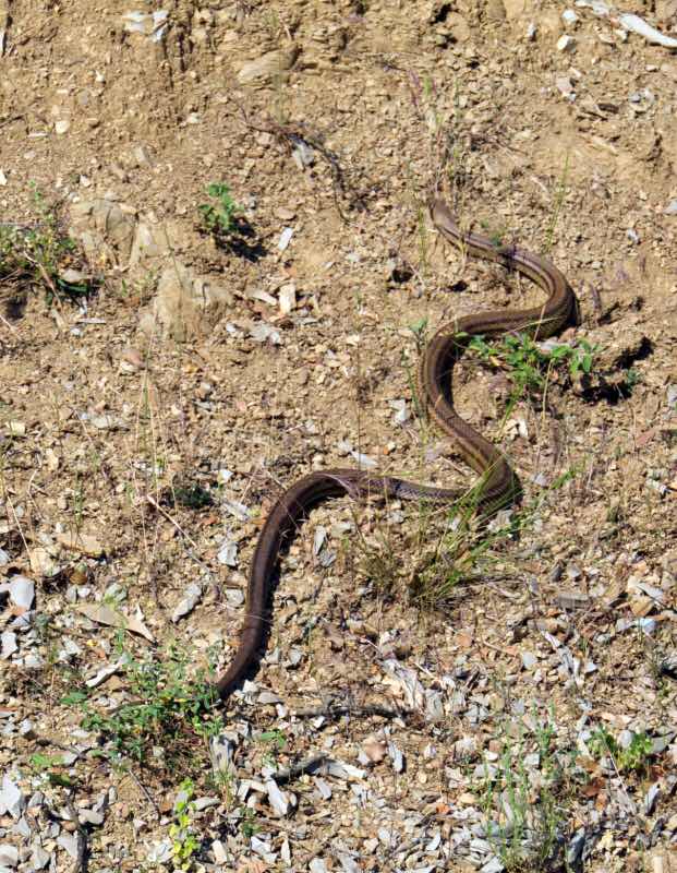 Die meisten Schlangen, denen wir bisher begegnet sind, lagen tot auf der Straße. Heute sehen wir eine lebende und können ein Foto schießen, bevor sie davonkriecht.