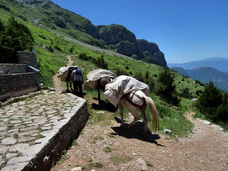Bei einer Rast werden wir von einem Maultierführer mit drei Tieren überholt, die wahrscheinlich Proviant zur Schutzhütte bringen.