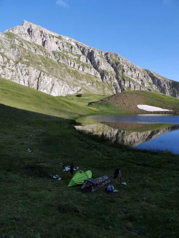 Da es hier keine Quelle gibt, fülle ich meine Wasserflasche mit Seewasser (dabei kommen erstmals der Sawyer-Wasserfilter und das mobile UV-Wasser-Desinfektions-Gerät zum Einsatz). Nachdem wir gegessen haben, bauen wir die Zelte auf. Etwas weiter weg vom See wird auch eine Gruppe griechischer Wanderer in der freien Natur übernachten.