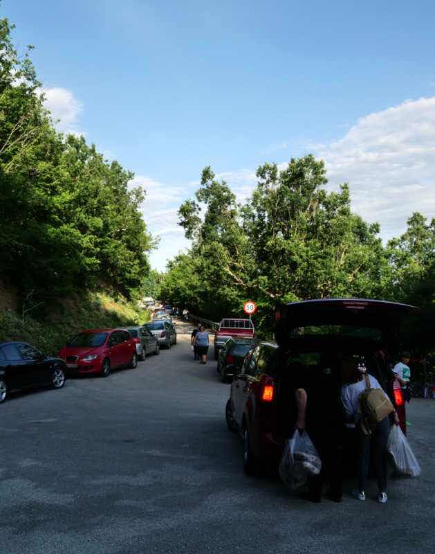 Da es schon halb sieben ist, wird es Zeit, einen Übernachtungsplatz zu finden. In Park4night ist ein Plätzchen beim Kloster Rogovo beschrieben, zu dem sehr wenige Leute fahren sollen. Die Abzweigung zur Stichstraße zum Kloster ist mit dem Wendekreis des Ducato nicht zu schaffen. Als ich zurücksetzen will, tauchen plötzlich drei Autos auf, die ebenfalls abbiegen wollen (was bei dem wenigen Verkehr, der hier üblicherweise herrscht, sehr eigenartig ist; wir fühlen uns wie in der Truman-Show, in der ein Regisseur Statisten und Schauspieler losschickt, um uns davon abzulenken, zu entdecken, dass wir uns in einer Fernsehsendung befinden). Ich fahre zunächst ein Stückchen weiter. Als wir denken, dass die Autos inzwischen das Kloster wieder verlassen haben, nehmen wir einen zweiten Anlauf. Kaum sind wir in die Stichstraße abgezweigt, tauchen hinter uns wieder zwei Fahrzeuge auf. Jetzt sitzen wir in der Falle, denn wir können in der engen Straße nicht mehr umdrehen. Der Weg zum Wendeplatz ist aber von zahlreichen Autos so zugeparkt, dass nur PKWs dorthin gelangen können. Im Kloster findet irgend eine Veranstaltung statt. Wir stellen uns möglichst nah an den Straßenrand, so dass andere (kleinere) Autos uns gerade noch passieren können, und müssen warten, bis die Veranstaltung zu Ende ist. Als die Autos der Besucher weg sind, können wir endlich zum Wendeplatz fahren, wo wir heute schlafen werden.