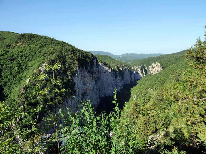 In der Karten-App sind in der Nähe zwei Aussichtspunkte eingetragen. Der Weg zum ersten hört jedoch einfach im Wald auf. Mein Verdacht wird dadurch bestärkt: wir befinden uns in der Randzone der Kulisse der Truman-Show. Gestern hat der Regisseur Dutzende Statisten losgeschickt, um zu verhindern, dass wir das „Ende der Welt“ erreichen. Wahrscheinlich wurde danach die ganze Nacht gearbeitet, um die Sets zu erweitern, aber mit diesem Aussichtspunkt sind sie nicht fertig geworden. Wir geben allerdings nicht auf und gehen auch zur zweiten Stelle mit Blick in die Vikakis-Schlucht. Hier haben die Bühnenbildner ganze Arbeit geleistet!