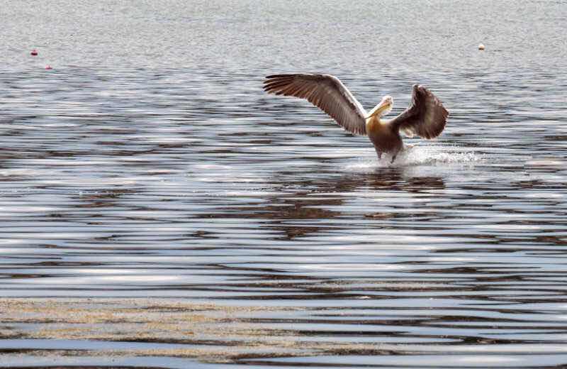 ... und beobachten einen Pelikan im Landeanflug.
