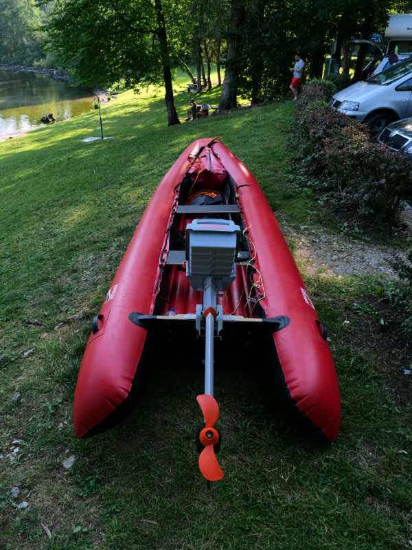 Um halb neun sind wir mit den Vorbereitungsarbeiten fertig. Wir schleppen das Boot hinunter ans Ufer, paddeln ein wenig, um in tieferes Wasser zu gelangen, und aktivieren dann den Elektromotor.