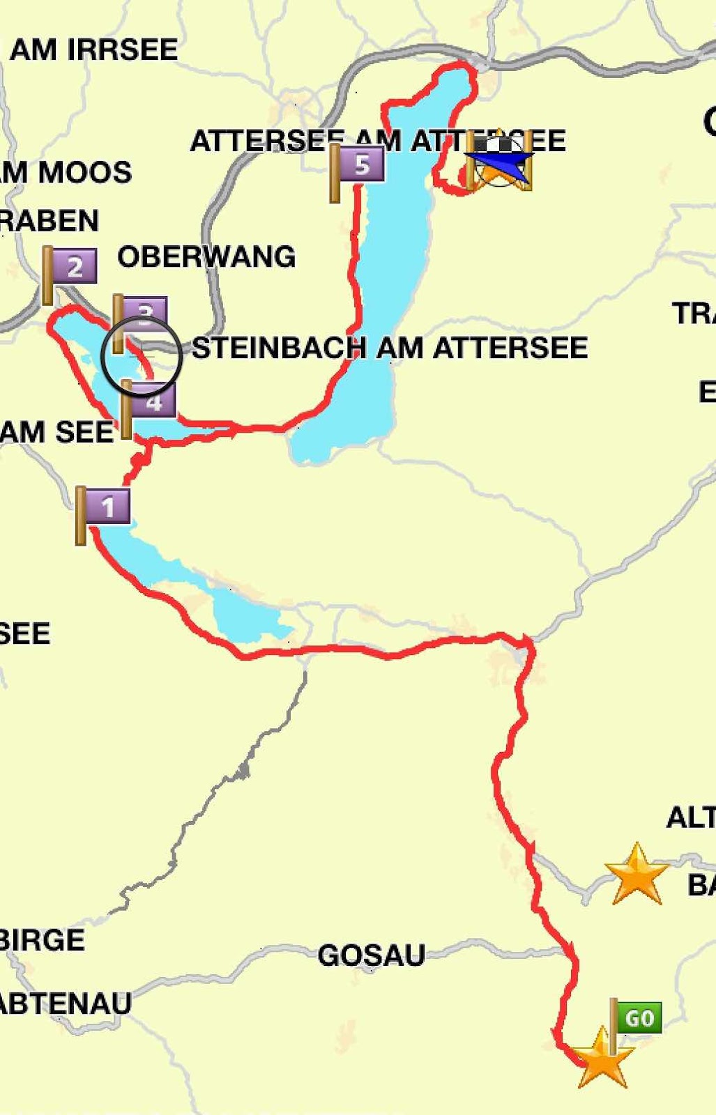 Am Nordende (wo der Fluß Traun den See verläßt) wenden wir und fahren am Ostufer entlang zurück.