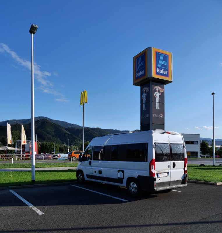 Da Mariä Himmelfahrt heuer auf einen Donnerstag fällt, bietet es sich an, einen Urlaubstag zu nehmen und das verlängerte Wochenende für eine Reisemobil-Tour zu nutzen. Ich verlasse um 13 Uhr das Büro, hole mein Gepäck aus der Wohnung und fahre in die Steiermark. Dort höre ich, dass ich diesen Ausflug allein unternehmen muss. Bisher wußte ich nicht, wohin die Fahrt gehen soll. Ich entscheide mich fürs Salzkammergut - dort gibt es so viel zu besichtigen und zu unternehmen, dass es sicher nicht der letzte Ausflug dorthin sein wird. Nach dem Abendessen breche ich um 18 Uhr auf. Im Mürztal halte ich beim Lidl (der diesmal Hofer heißt), um ein paar Lebensmittel zu kaufen.