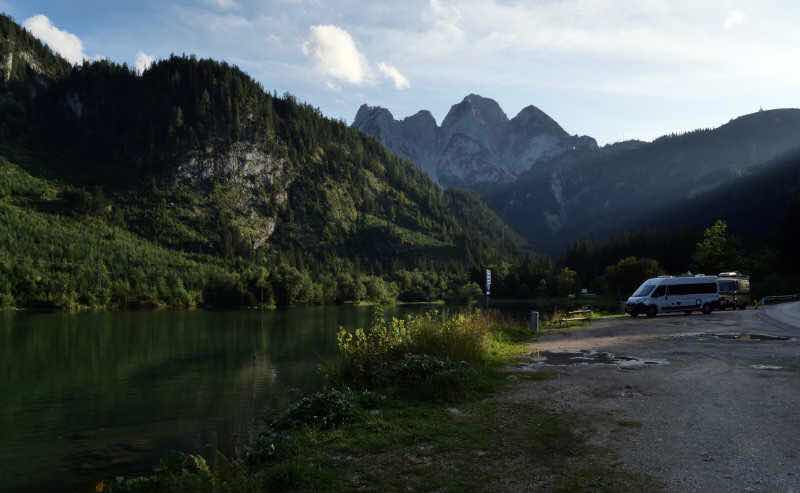 Für morgen ist schönes Wetter vorhergesagt. Ich möchte eine weitere Wanderung am Gosausee unternehmen, darum kehre ich zum Staubecken Gosauschmied zurück, um hier zu übernachten (am Park4night-Platz auf der anderen Seite des Stausees standen mindestens zwei Reisemobile, so dass ich gleich wieder umdrehte).