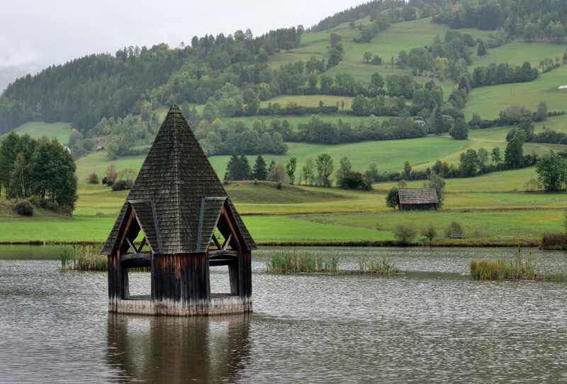 Im Rottenmanner Teich wurde ein „Kirchturm“ gebaut, der an eine Sage vom Untergang der Stadt aufgrund des frevelhaften Verhaltens der Bewohner erinnert. Wir essen hier zu Mittag.