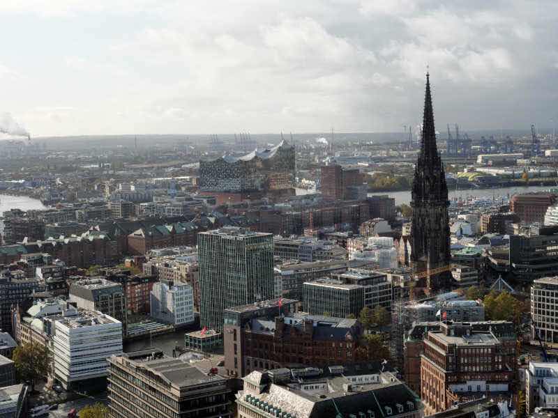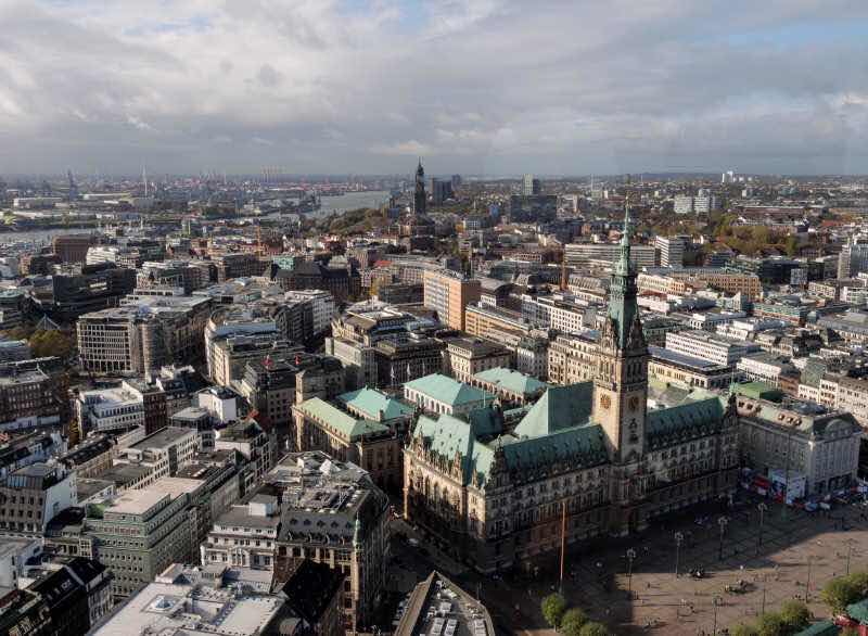 Heute steige ich am Hauptbahnhof aus. Ich spaziere (mit kleinen Abstechern) durch die Rosenstraße fast bis zum Rathaus und durch die Mönckebergstraße zurück zum Bahnhof. In diesem Stadtteil gibt es viele Geschäfte und Einkaufszentren, zum Beispiel die Europa-Passage. Ich besichtige zwei Kirchen, St. Petri und St. Jacobi, und steige in ersterer nach Bezahlung von 4 EUR Eintritt bis zum 123 m hoch gelegenen Aussichtspunkt in der Kirchturmspitze. Dabei sind 544 Stufen zu überwinden. Im Turm befindet sich auf einer Höhe von 111 Stufen auch ein kleines Feuerwehrmuseum. Um 13 Uhr bin ich zurück im Reisemobil und esse einen Mittagssnack.
